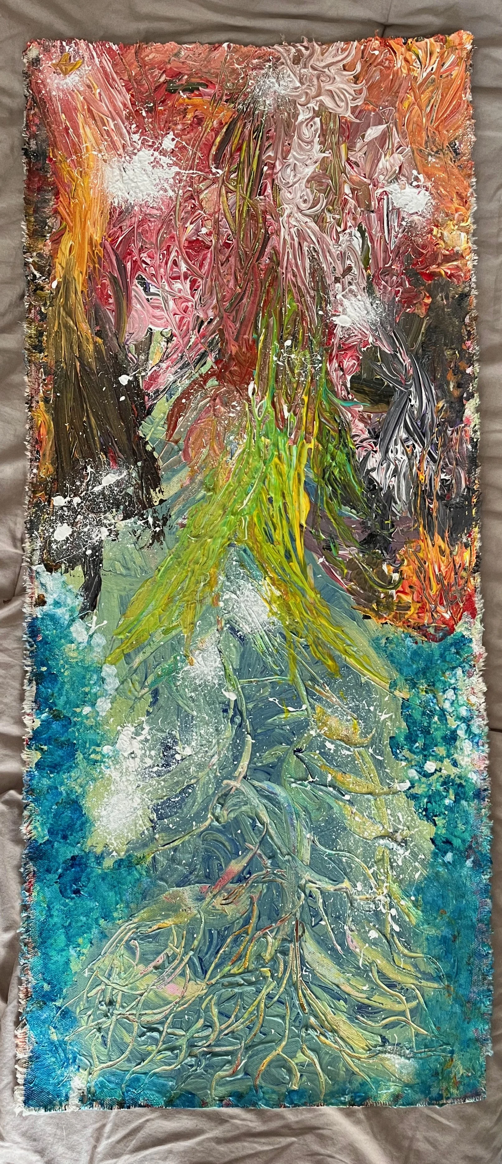 ACRYLIC & POURING MEDIUM ON RAW CANVAS (3X1’).
